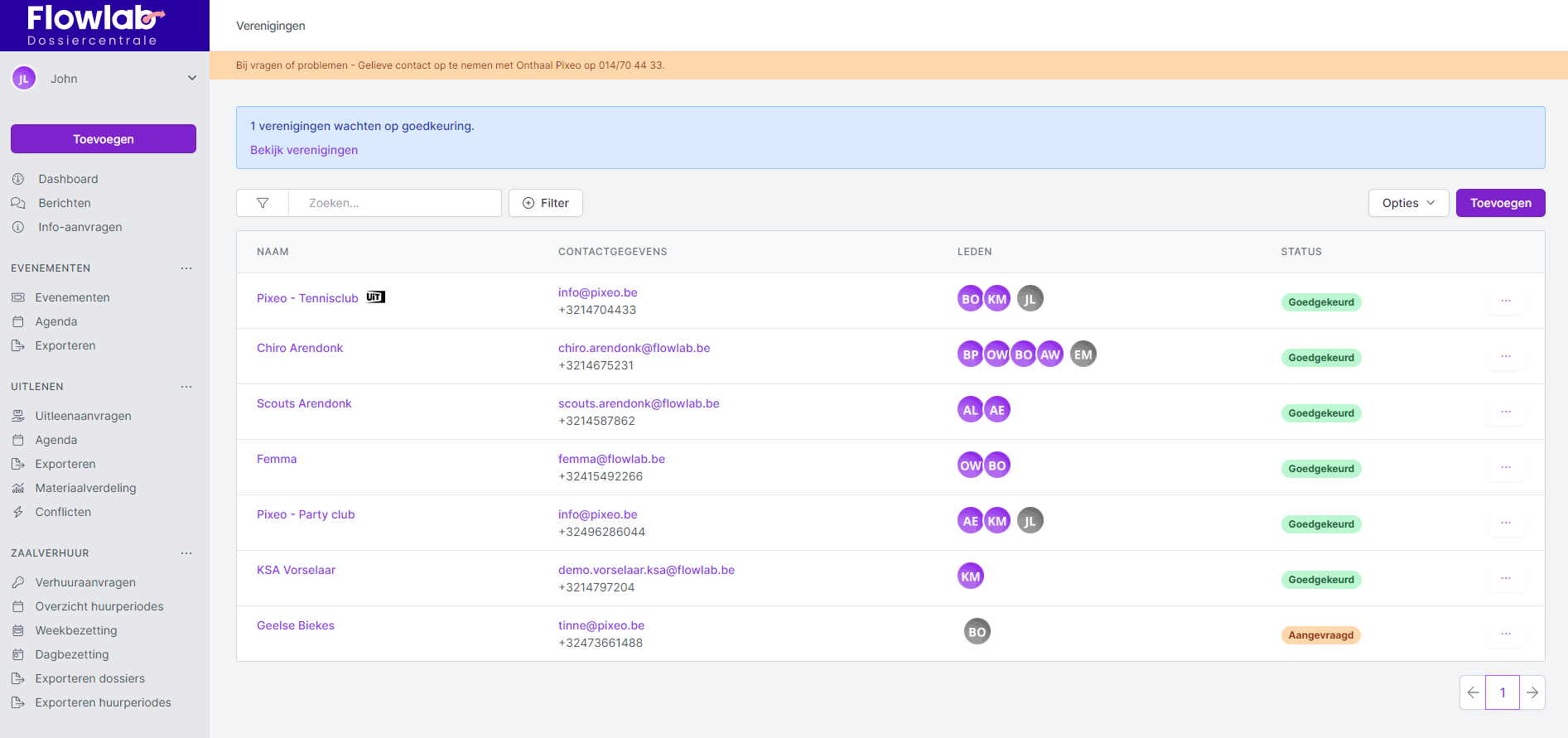 - Je krijgt nu het overzicht van alle verenigingen die reeds aangemaakt zijn, met vermelding van hun status: