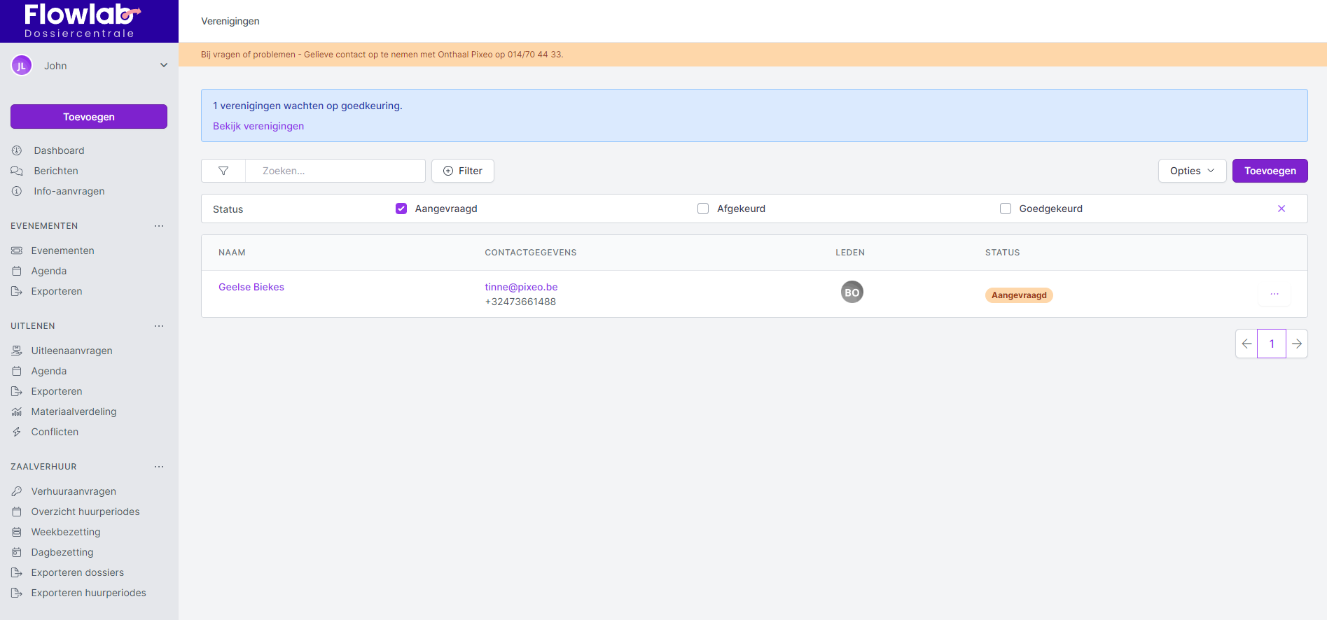 - Nadat je de status van de vereniging aanpast (goedkeuren of afkeuren), verschijnt er een groene balk boven het overzicht EN verdwijnt de vereniging uit het overzicht gezien hiervoor de filter Aangevraagd aanstaat.