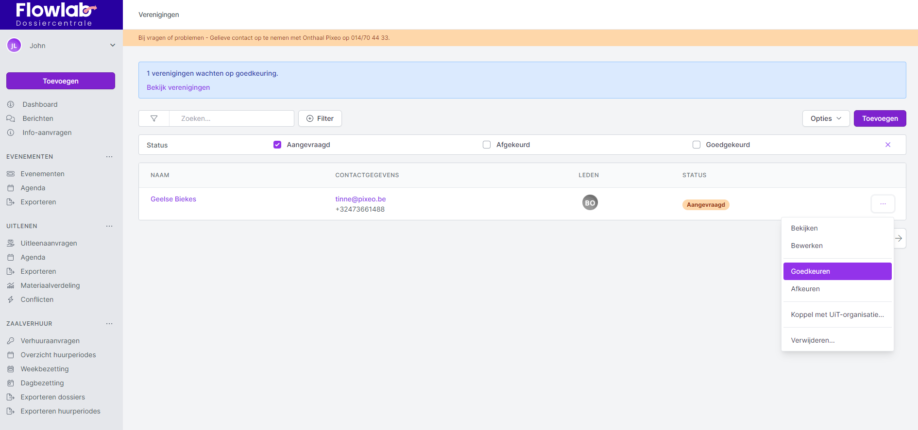 - Wanneer er één of meerdere verenigingen goedgekeurd moeten worden, zie je dit bovenaan in de blauwe balk staan.