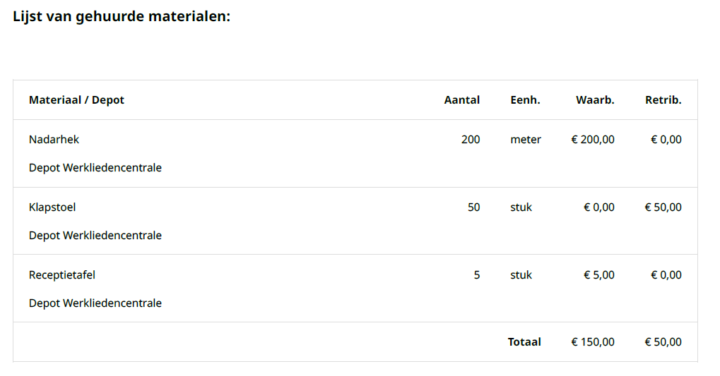 - Lijst van gehuurde materialen - een overzicht van de materialen, met vermelding depot, aantal, waarborg en retributie