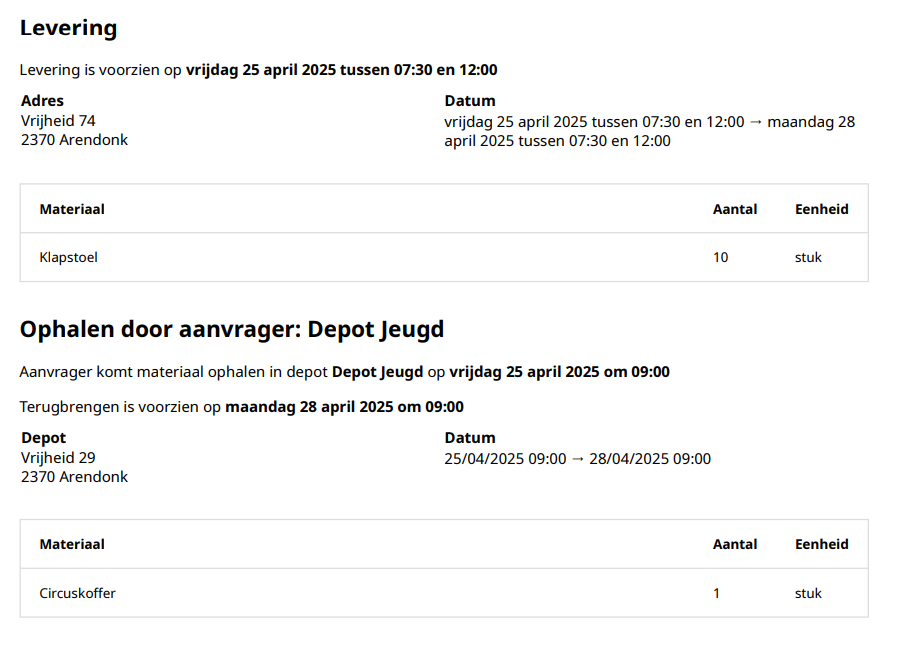 - Wanneer er zowel materialen geleverd als opgehaald dienen te worden door de aanvrager zelf, krijg je eerst een overzicht van de te leveren materialen en daarna een overzicht voor de zelf op te halen materialen, met vermelding van het voorziene tijdstip en het adres van het depot.