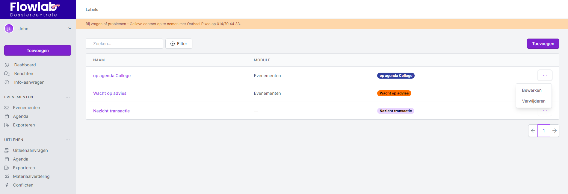 - In het overzichtsscherm klik je achteraan het betreffende label op de drie bolletjes en kies je voor Bewerken of Verwijderen.