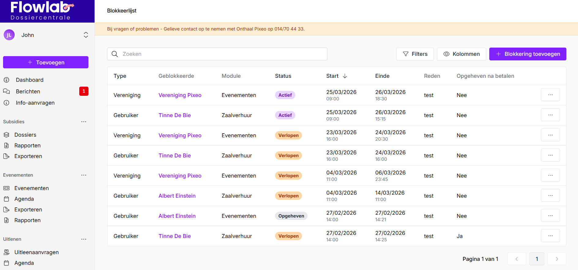 Via de Blokkeerlijst kan je gebruikers en verenigingen tijdelijk blokkeren voor nieuwe aanvragen in een bepaalde module.