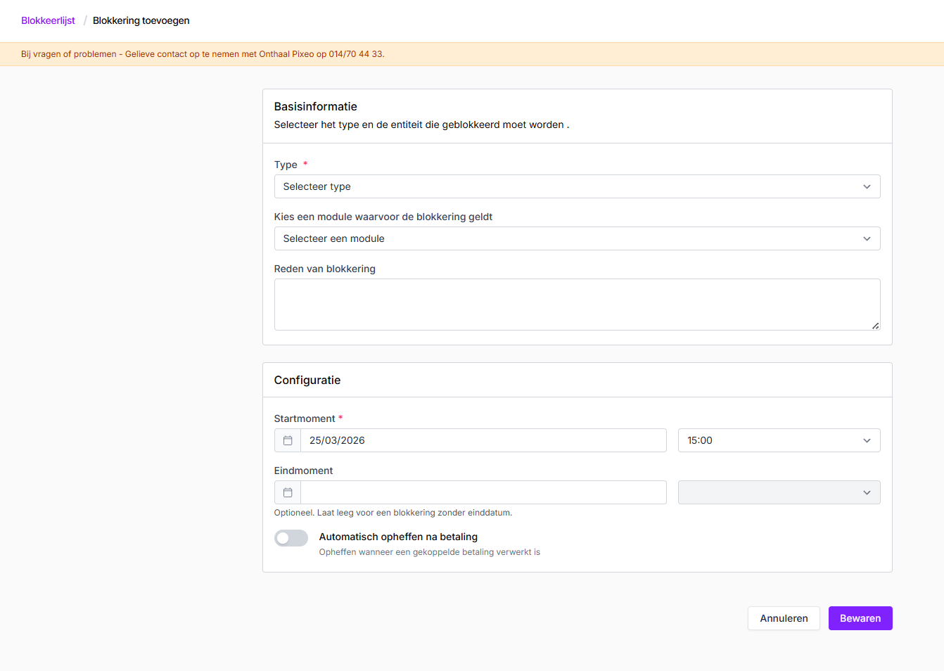 - Reden: hier kan je vrij ingeven wat de reden van blokkering is