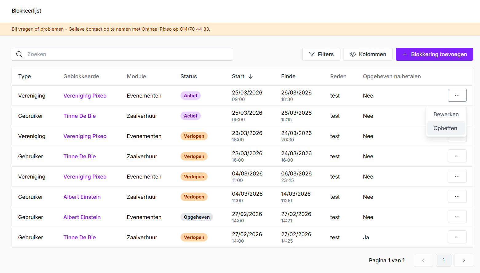 Als beheerder kan je een blokkering manueel opheffen. Hiervoor klik je op de drie bolletjes achteraan de blokkering en kies je voor Opheffen.