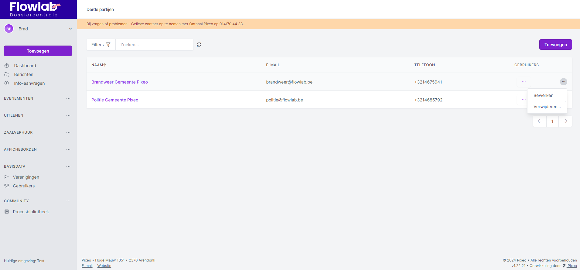 De functie Derde partijen, onder Basisdata, biedt een overzicht van de verschillende diensten buiten de gemeente waarmee samengewerkt wordt, zoals politie en brandweer.