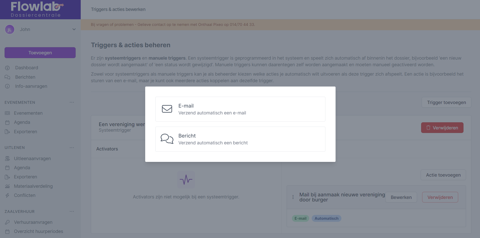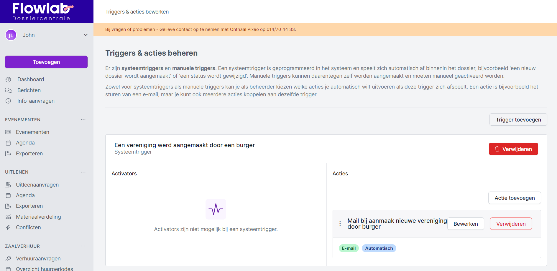 Triggers en acties kom je op verschillende plaatsen tegen in Flowlab. Hier onder Basisdata stel je acties in voor triggers die gelinkt zijn aan verenigingen en het versturen van mails bij berichten.