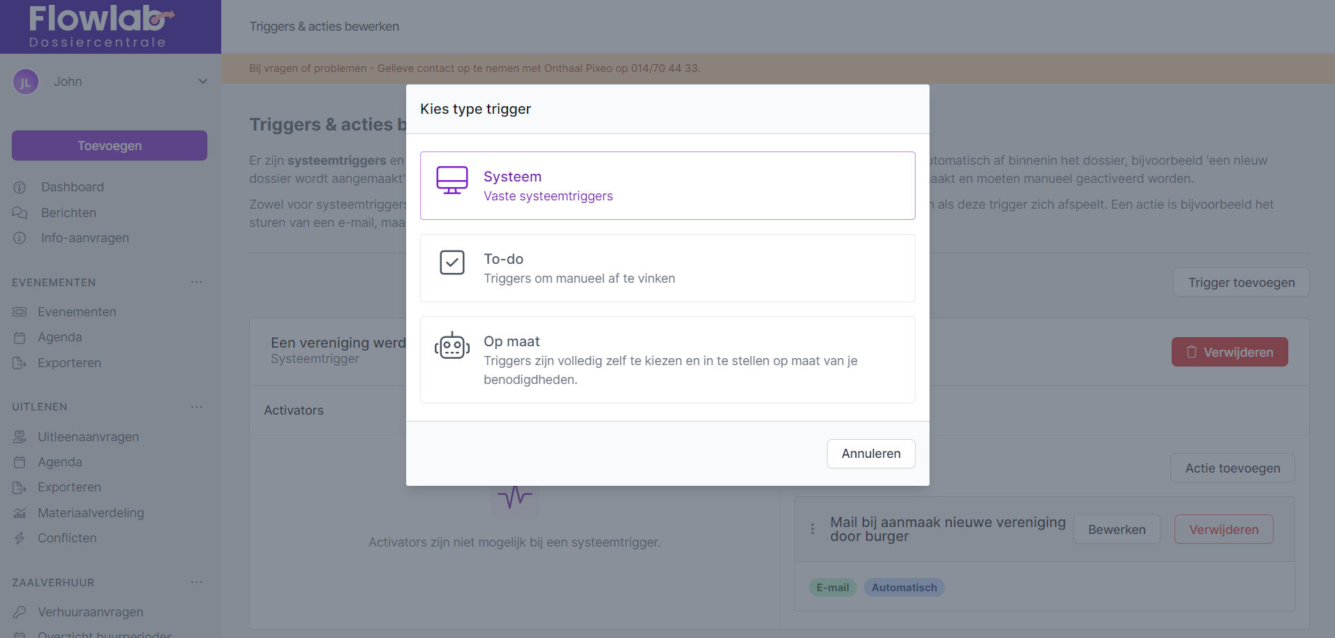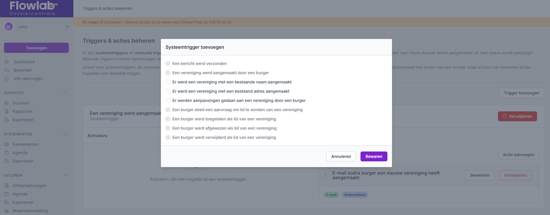 - Vink de systeemtriggers aan waarvoor je een actie wil instellen. (Een aantal staan reeds standaard ingesteld, de inhoud kan je ten alle tijden zelf aanpassen naar wens.)