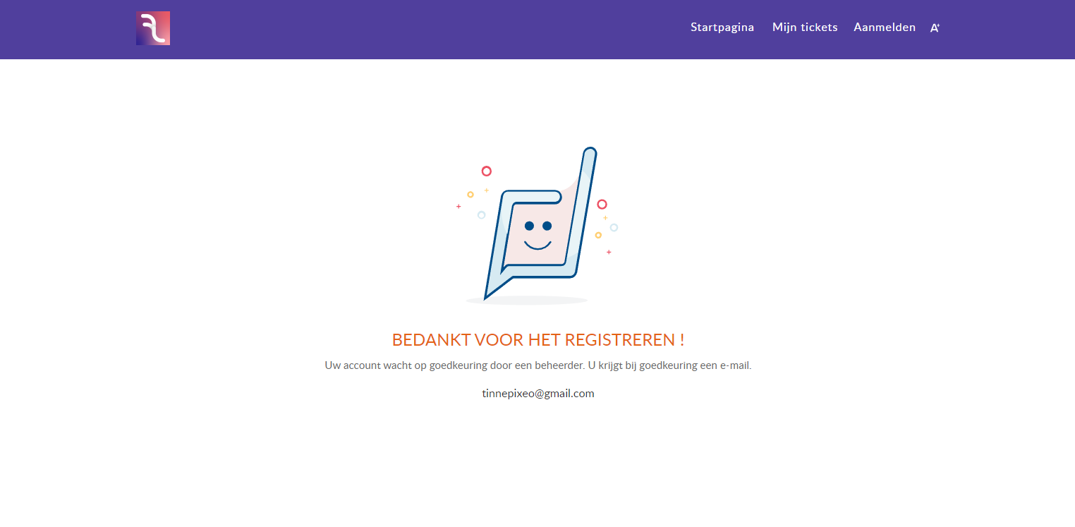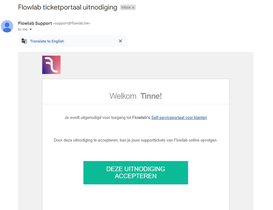 - Eens wij deze melding goedkeuren, ontvang je per mail een uitnodiging voor het ticketportaal van Flowlab.