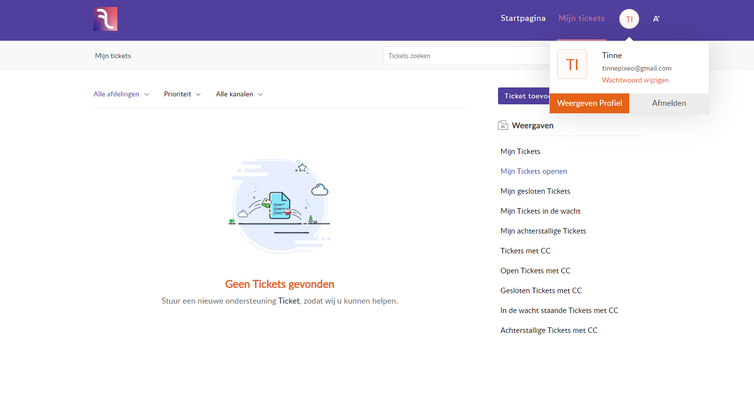 - Klik op Tickets in het midden of in het menu bovenaan op Mijn tickets om een overzicht te bekijken van jouw ingediende tickets en hun status.