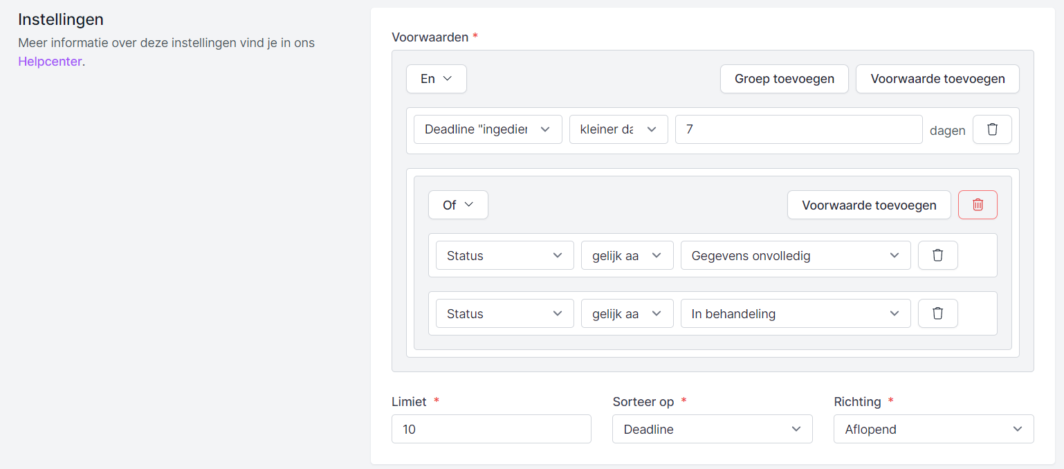 In het voorbeeld zie je dat de eerste knop op 'EN' staat. Die laat zien dat er zowel aan de eerste groep voorwaarden (deadline 7 dagen) en de tweede groep (statussen) moet worden voldaan.