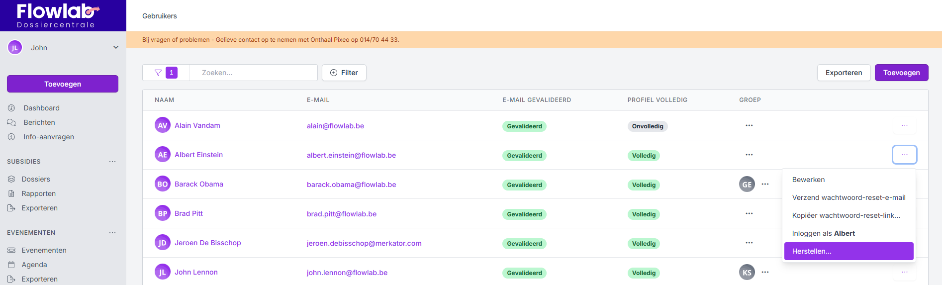 - Verschijnt de gebruiker nu wel, dan kan je deze Herstellen via de drie bolletjes achteraan. De gebruiker verschijnt nu terug in de lijst van de gebruikers. Indien nodig kan je zijn gegevens nakijken en een wachtwoord-reset-e-mail versturen.
