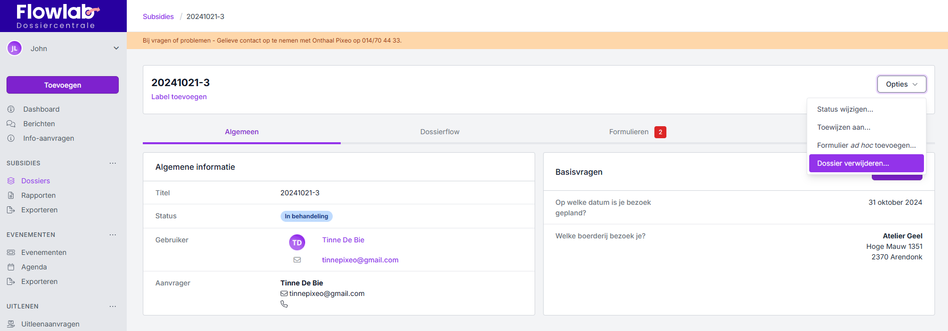 - Klik rechts bovenaan op Opties en kies voor Dossier verwijderen.