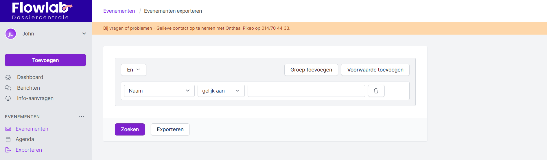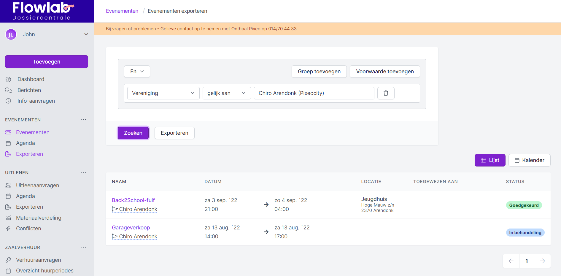 Via Exporteren bij de module Evenementen kan je een lijst van evenementen trekken die aan bepaalde voorwaarden voldoet. Deze lijst kan je gewoon zoeken en raadplegen of exporteren.