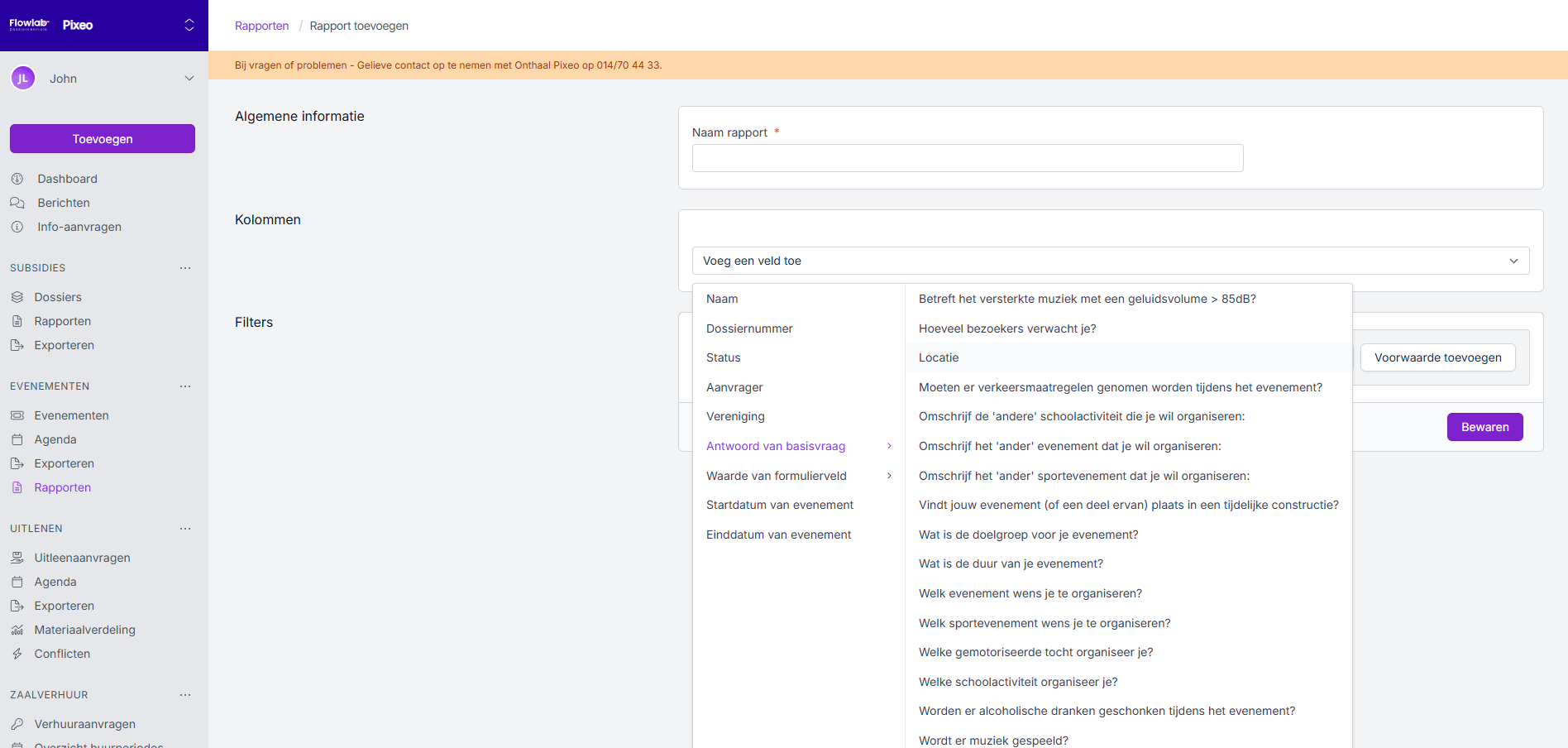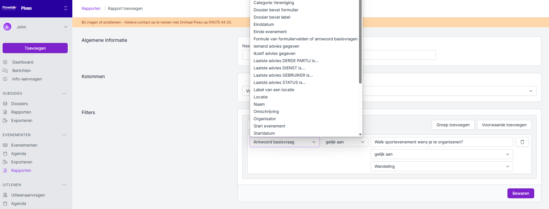 Via Rapporten bij de module Evenementen kan je verschillende rapporten op maat aanmaken en exporteren. Je kan hierbij zelf de kolommen bepalen en werken met voorwaarden als filter. De rapporten zijn individueel in te stellen per beheerder.