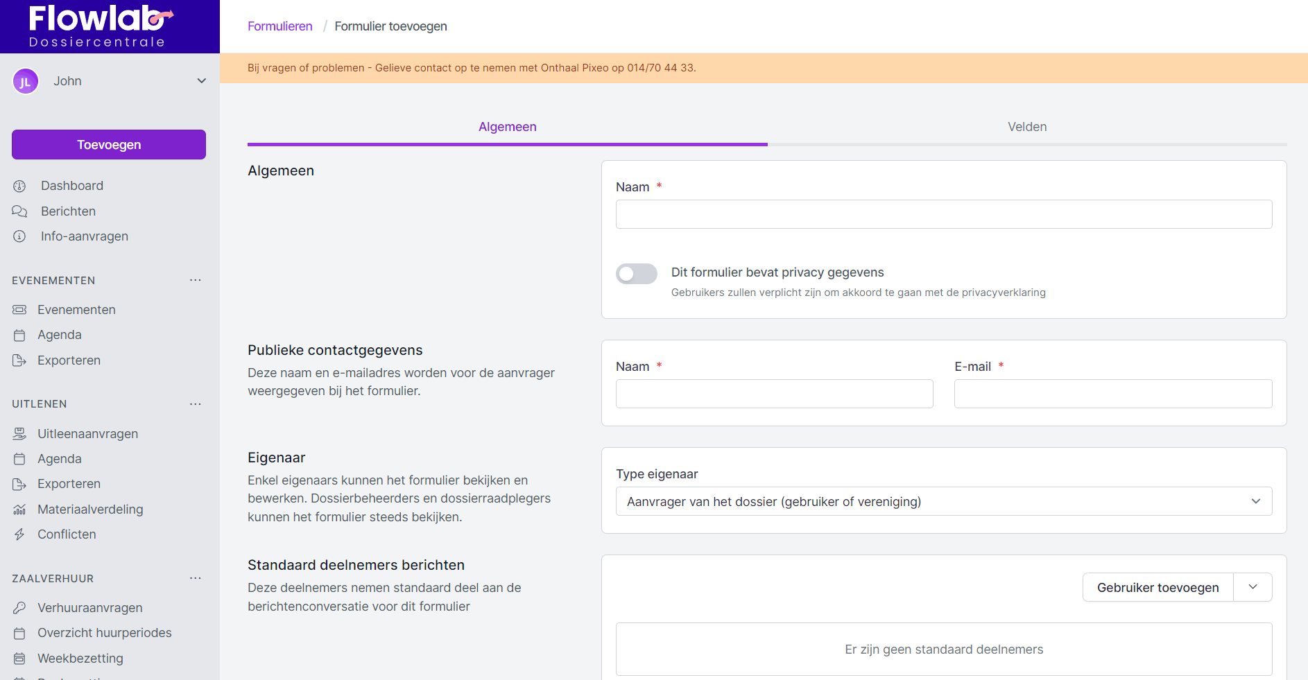 - Publieke contactgegevens: Deze naam en e-mail worden bij het formulier weergegeven als contactgegevens voor meer info of hulp bij het formulier.