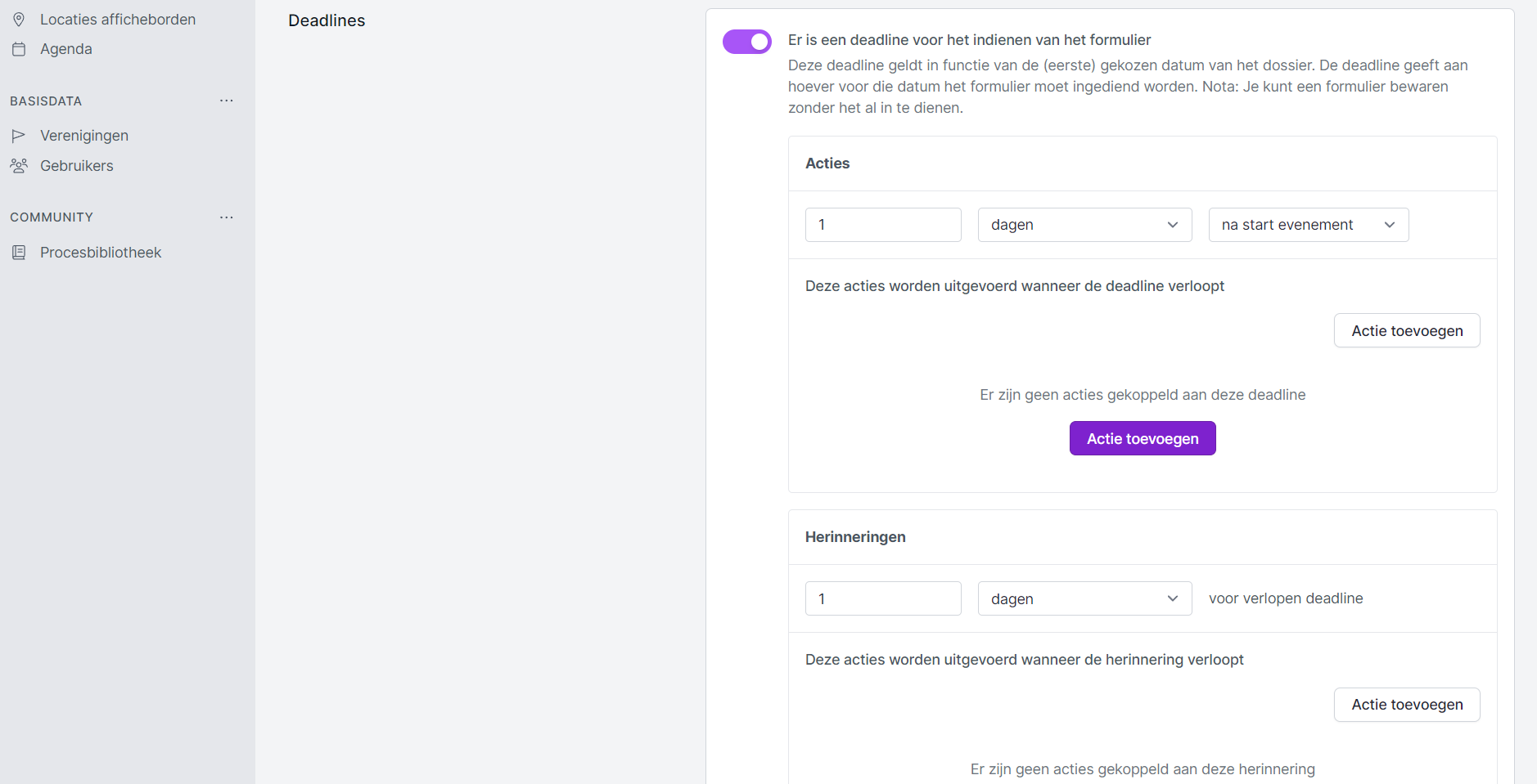 - Afhankelijk van de door jullie bepaalde dossierflow kan je een actie toevoegen wanneer de deadline verlopen is zoals het versturen van een mail.