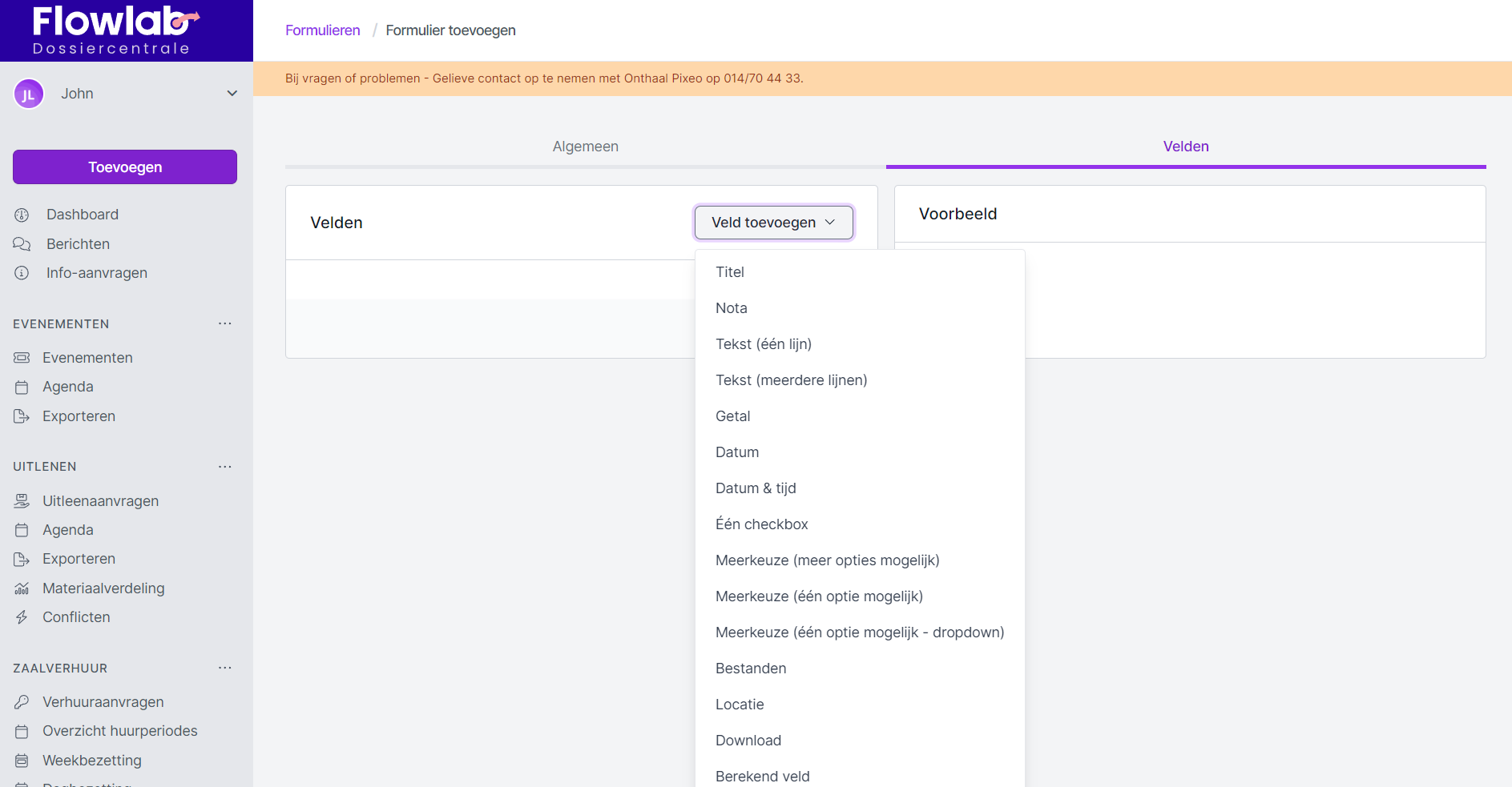 - In de linkerkolom voeg je velden toe door het gewenste veldtype uit de lijst te selecteren. Het gekozen veld wordt toegevoegd aan de linkerkolom.