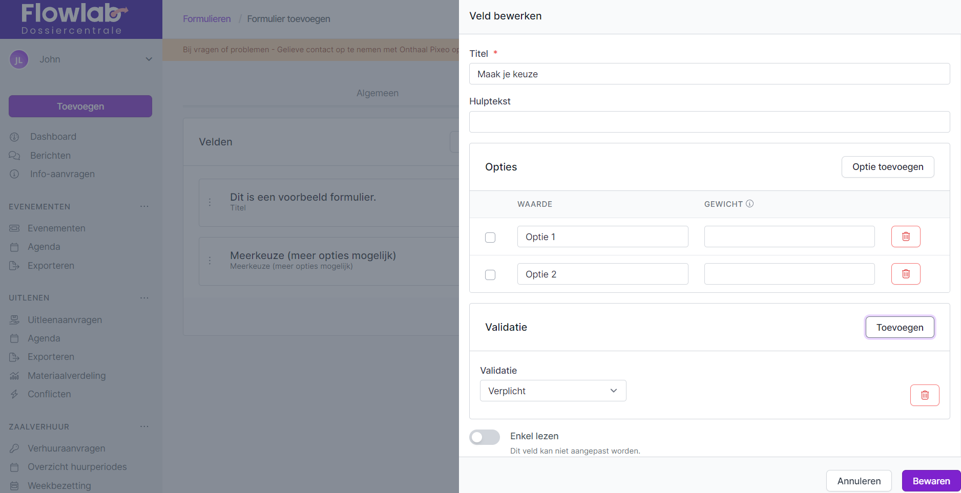 - Enkel lezen: deze velden kunnen niet aangepast worden door de aanvrager. Deze optie kan gebruikt worden bij titels en nota's of velden met een berekening.