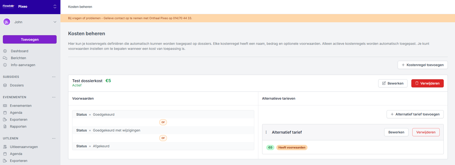 - Voorwaarden: Hier kan je exact bepalen onder welke voorwaarden de kosten aan een dossier toegevoegd moeten worden.