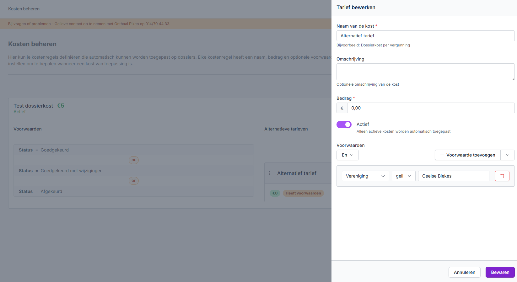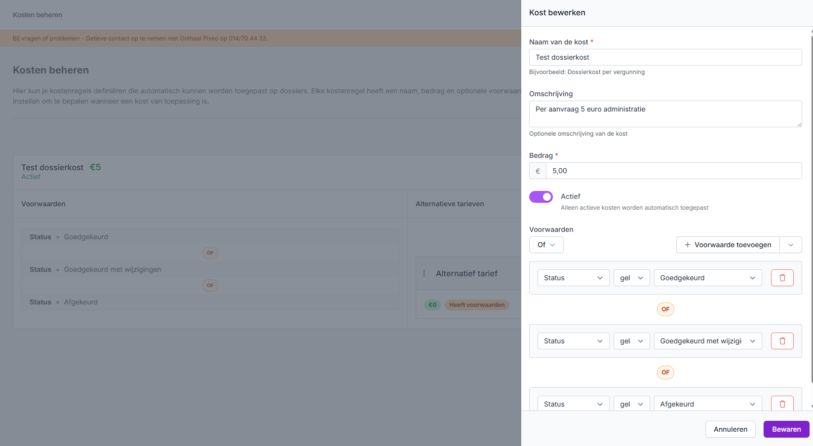 - Voorwaarden: Hier kan je exact bepalen onder welke voorwaarden de kosten aan een dossier toegevoegd moeten worden - dit zijn extra voorwaarden bovenop de standaardvoorwaarden welke bij stap 1 ingesteld werden.