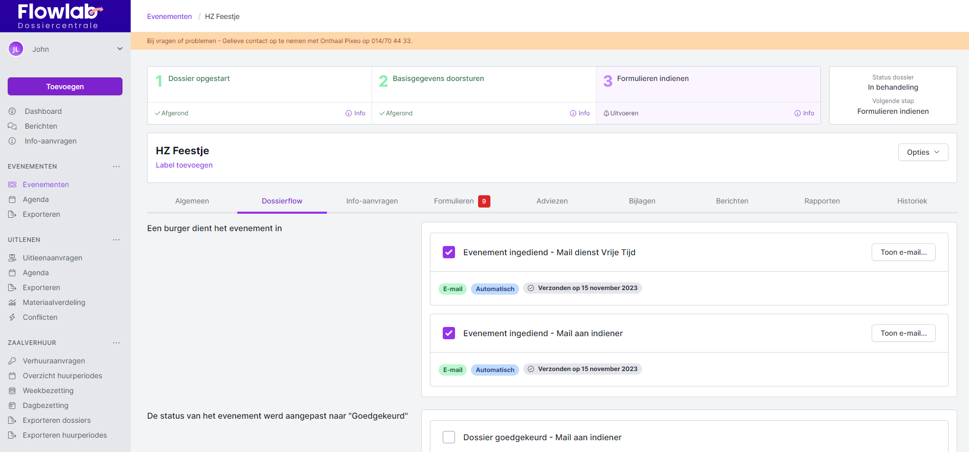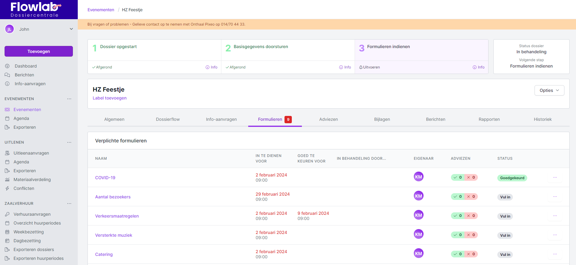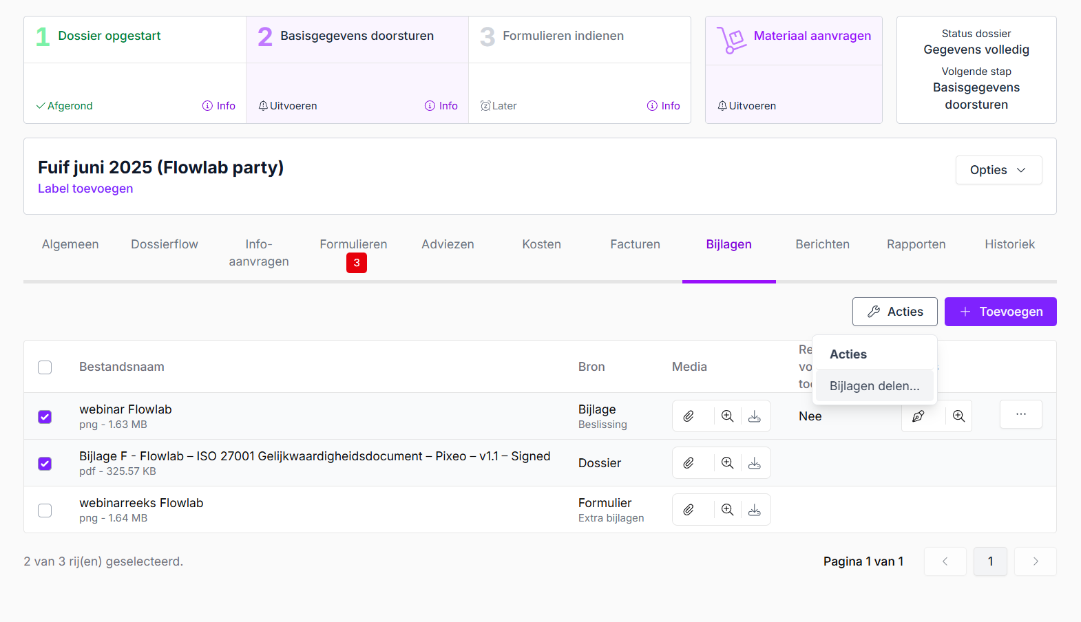 - 3 Formulieren indienen: in dit voorbeeld staat deze stap nog op Uitvoeren, wat betekent dat nog niet alle formulieren werden ingevuld en doorgestuurd.