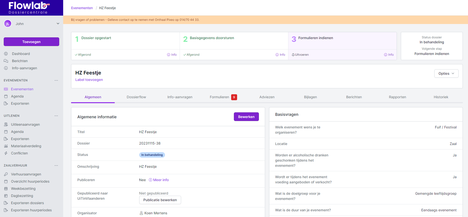 - Algemene informatie: hier zie je welke informatie de gebruiker heeft ingediend over het evenement - deze kan je als dossierbeheerder zelf ook bewerken indien nodig.