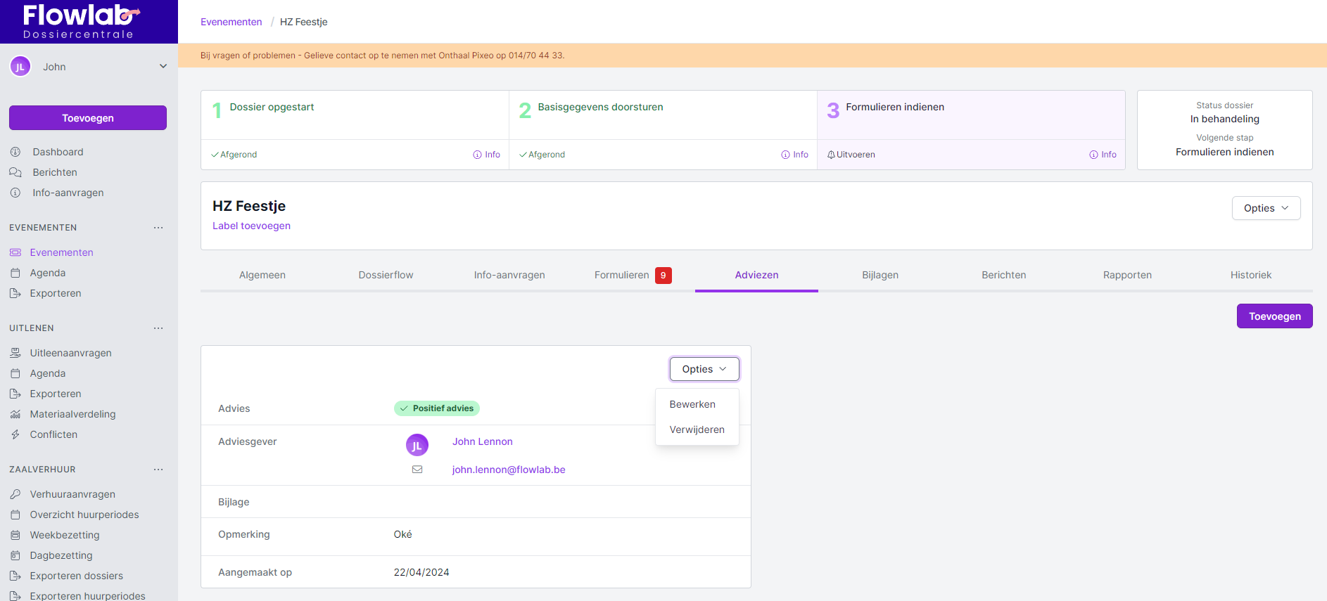 - Klik in het tabblad Adviezen bij een evenementsaanvraag op Opties bij het advies.