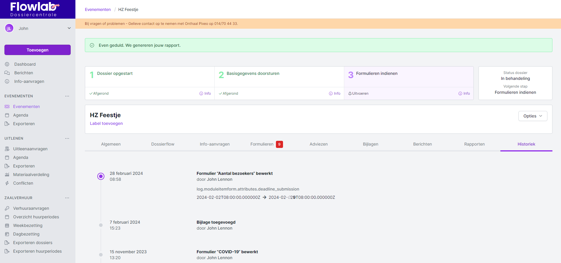 In het tabblad historiek bij een evenementsaanvraag zie je welke wijzigingen er wanneer gebeurd zijn in een dossier. Zowel de aanpassingen door de gemeente (dossierbeheerder) als door de burger (de aanvrager) worden vermeld.