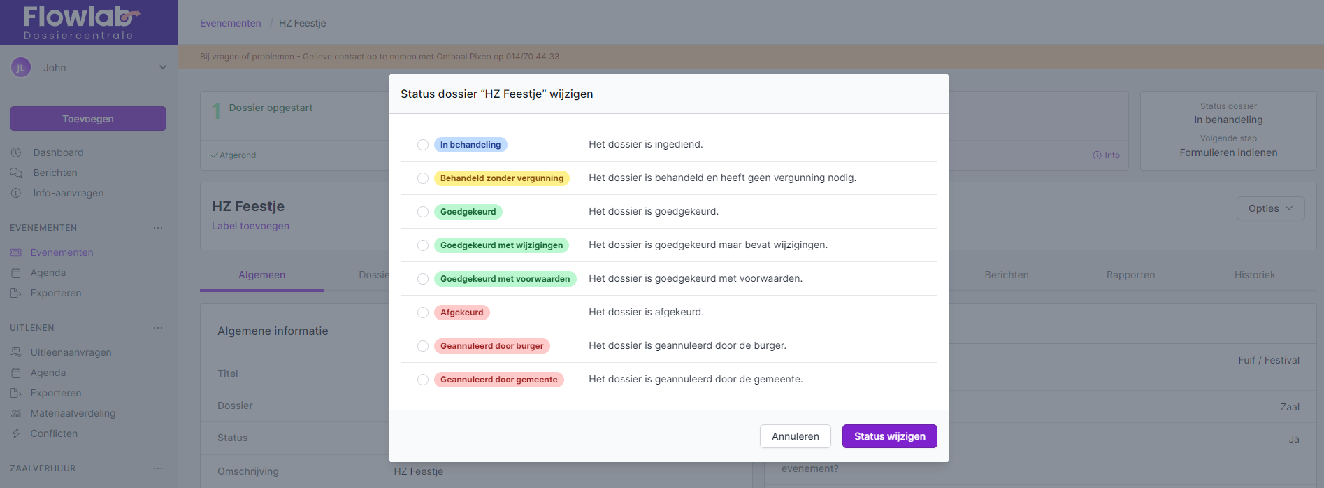 Je hebt nu alle informatie over het evenement verwerkt en je bent klaar om een beslissing te nemen voor het dossier. Dat doe je door de status van het dossier te wijzigen.