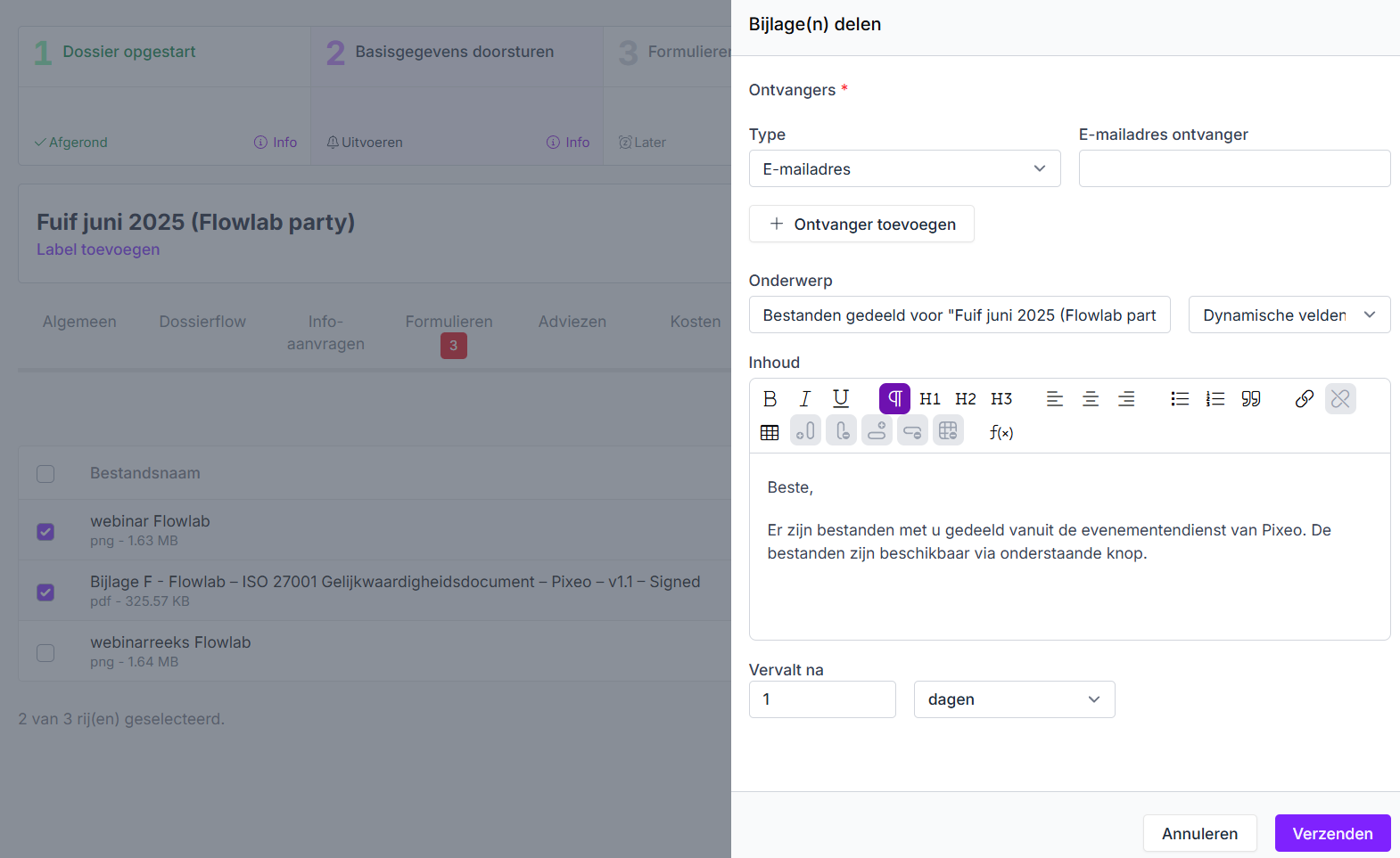 - Relevant voor de toekomst: Duid aan of deze bijlage ook voor volgende evenementen relevant is.