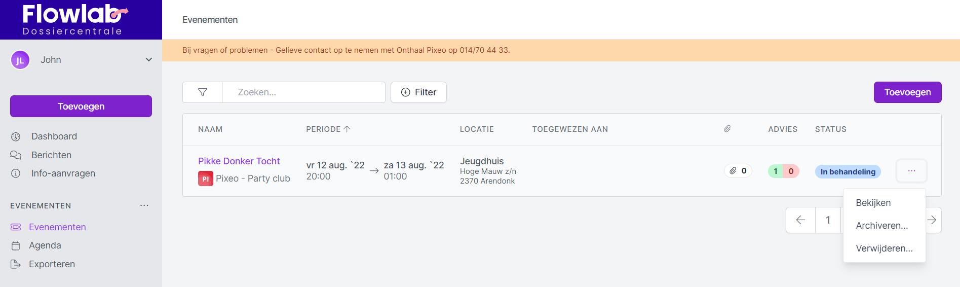 Om overzicht te bewaren in de lijst van evenementsaanvragen, kan je foutieve of geannuleerde aanvragen verwijderen.