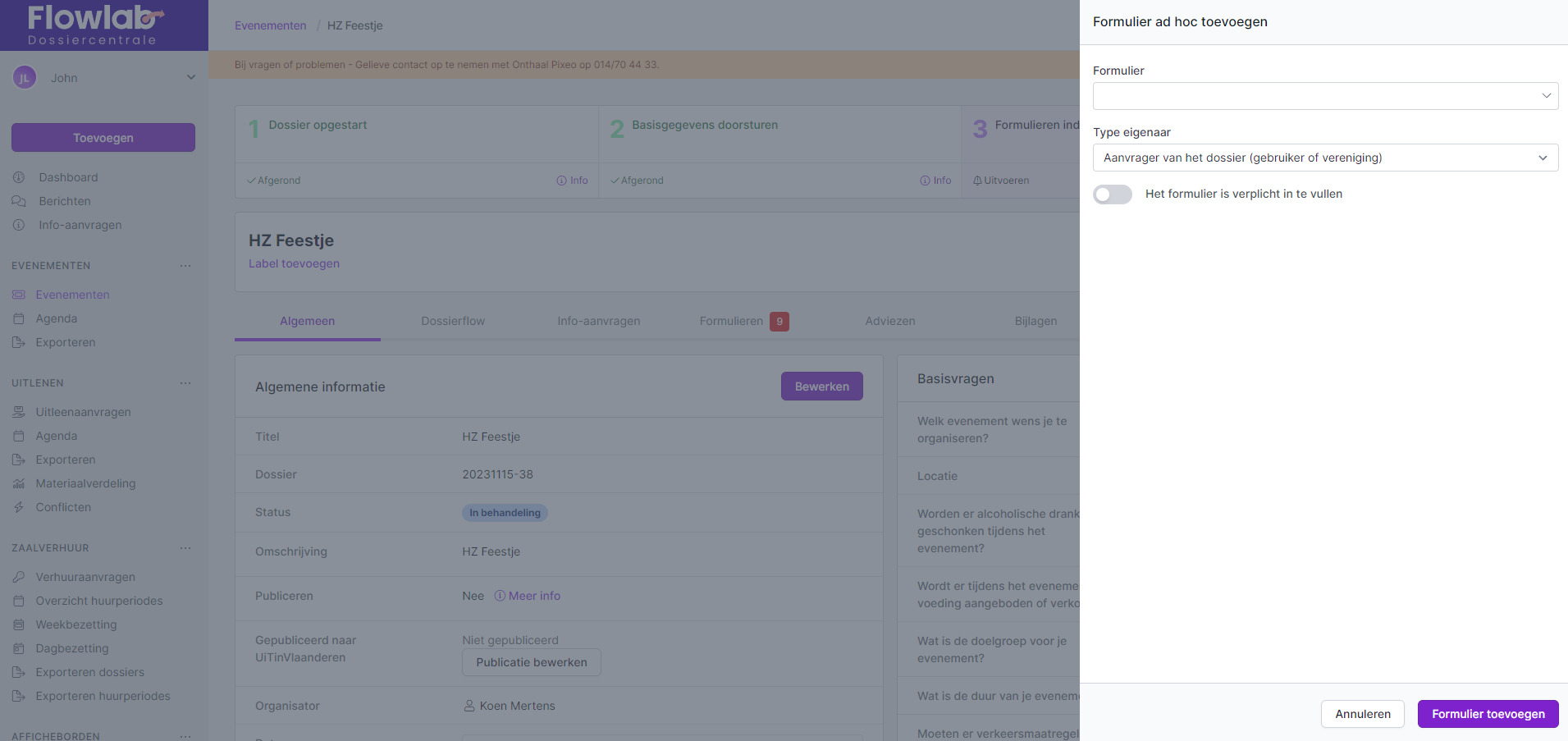 Hoe voeg ik een formulier ad hoc toe aan een evenementsaanvraag?