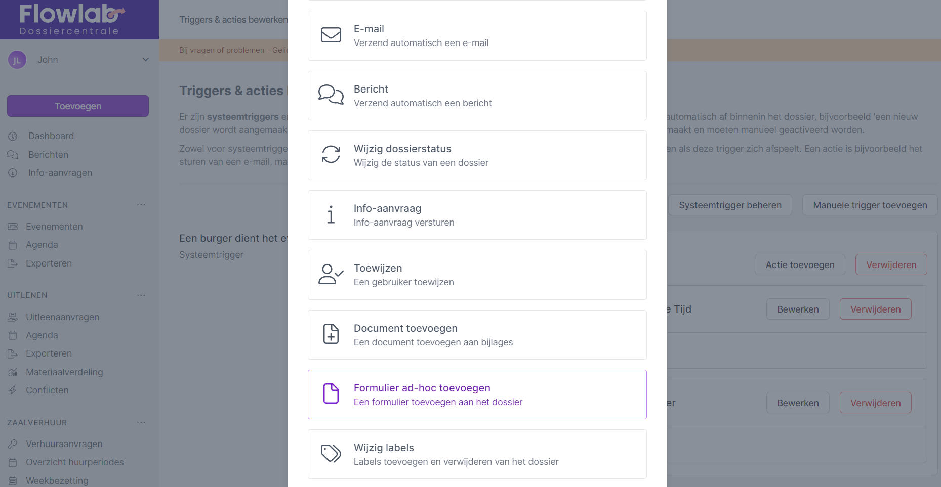 - Klik op Actie toevoegen bij de systeemtrigger Een burger dient het evenement in.