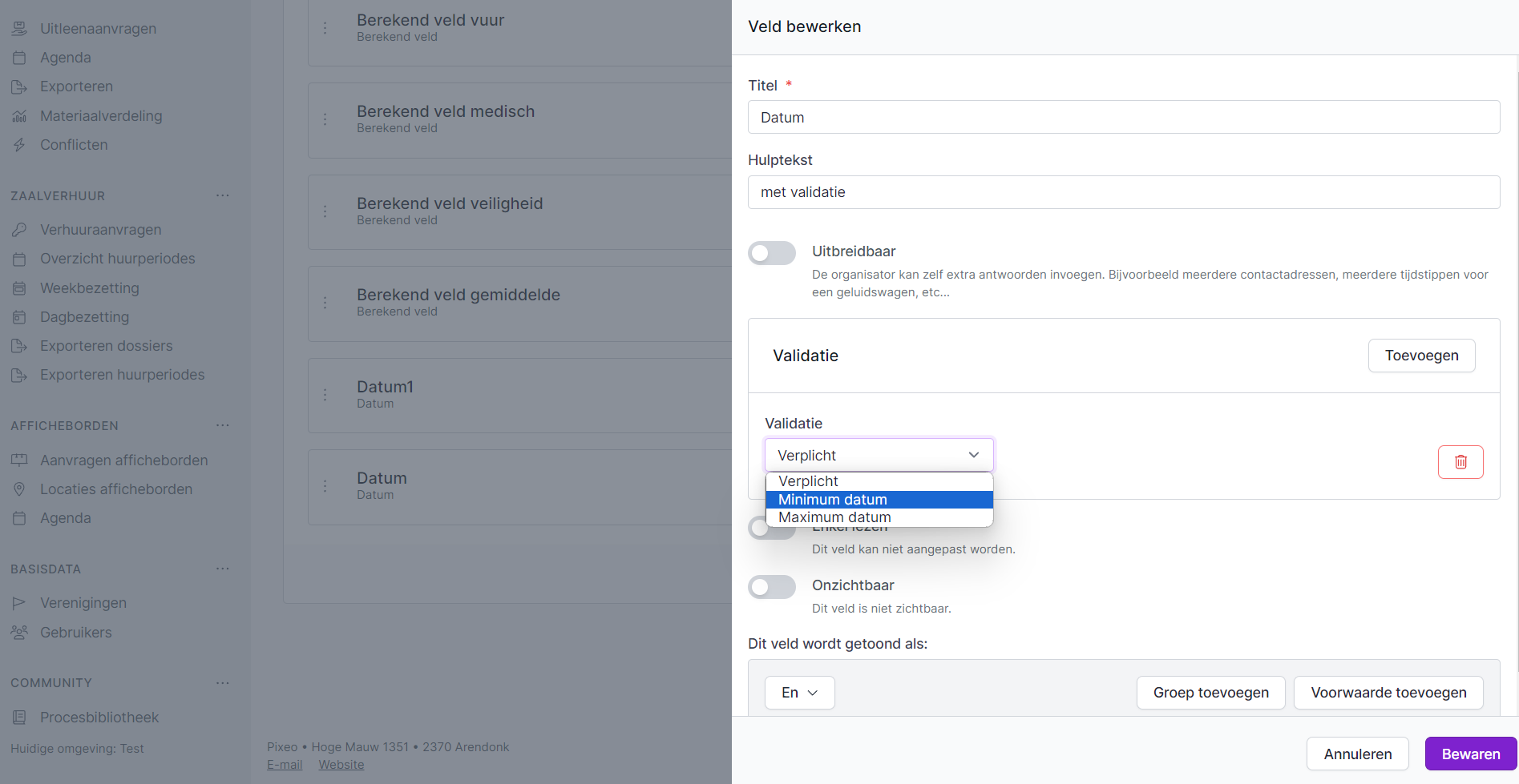 Bij het veldtype Datum kan je een validatie toevoegen die de datumselectie beperkt tot een bepaalde periode, voor en/na een bepaald tijdstip.
