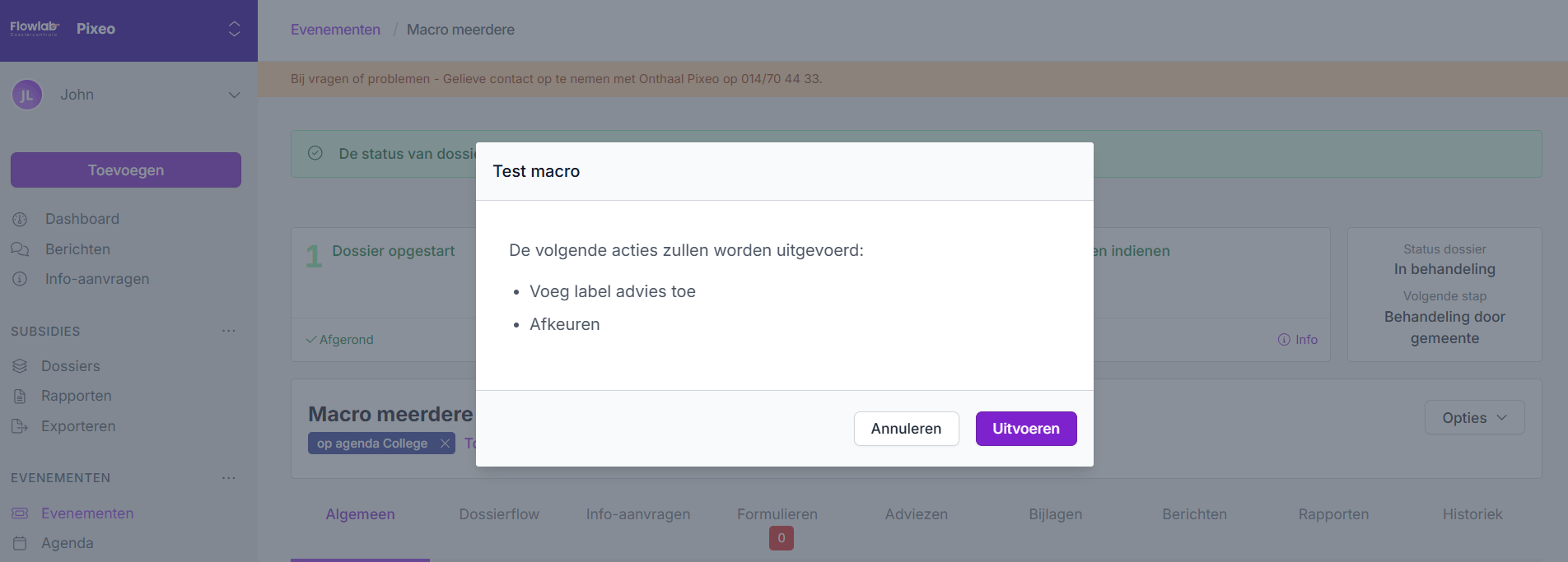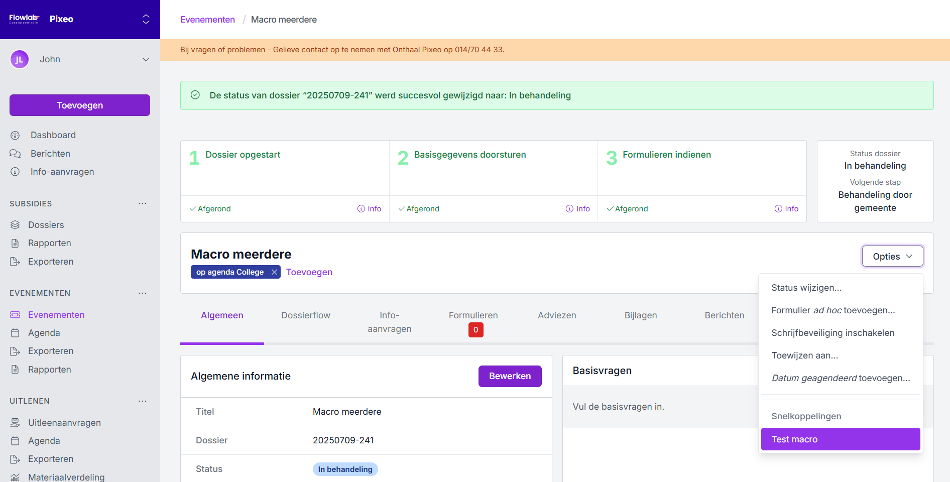 - Na het uitvoeren van de acties, zie je bovenaan een bevestiging. Voor sommige acties kan het nodig zijn je scherm te refreshen om het resultaat te zien.