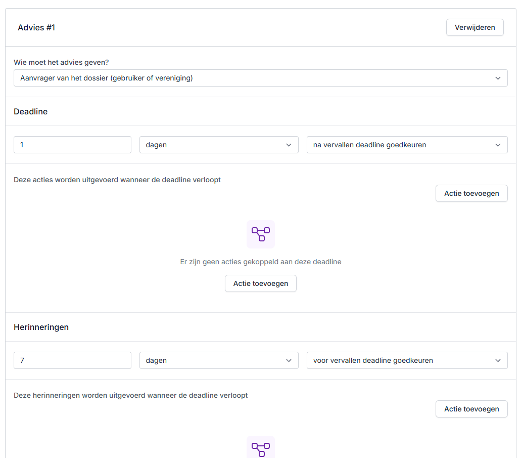 - Deadline - hier kan je bepalen wat er moet gebeuren nadat de deadline vervallen is. Bijvoorbeeld wanneer het advies bij het formulier niet of te laat gegeven wordt, vertrekt er een mail naar X of wijzigt de status van het formulier naar afgekeurd.