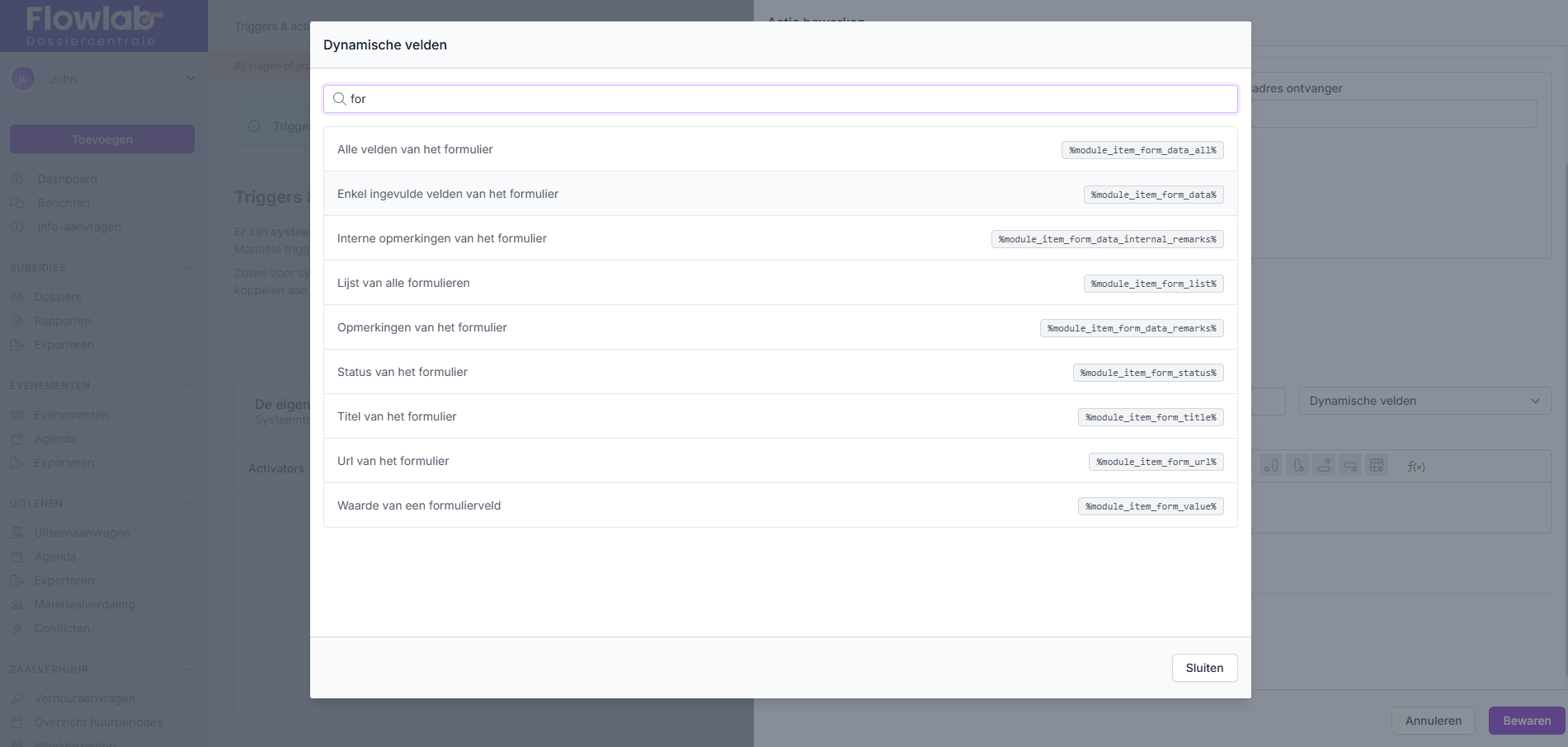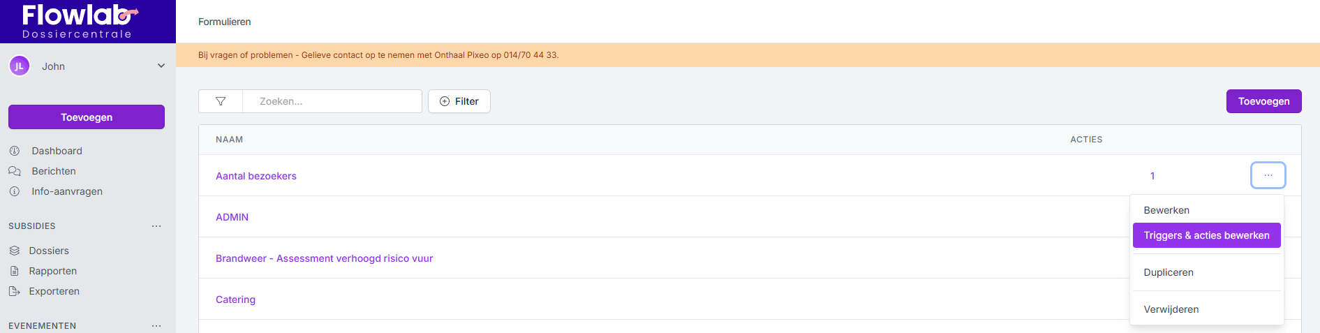 - Keer terug naar het overzicht van de formulieren en kies bij het formulier achteraan, via de drie bolletjes, voor Triggers en acties bewerken.