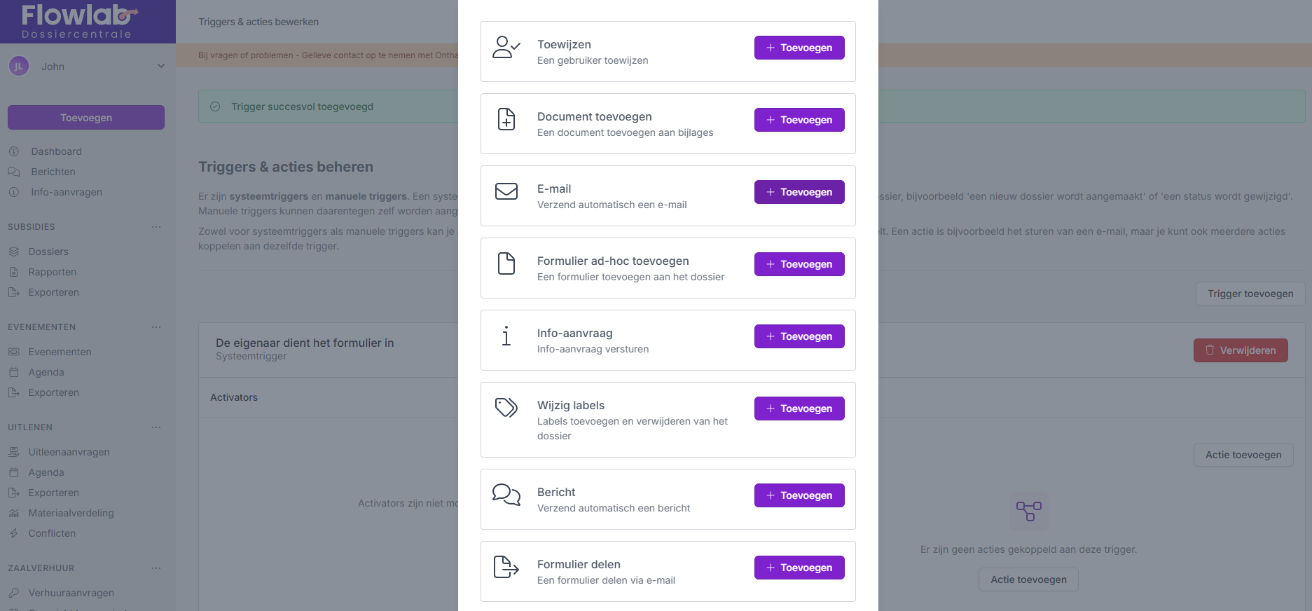 Nu kan je een actie toevoegen bij de ingestelde trigger. De actie die je kiest is afhankelijk van