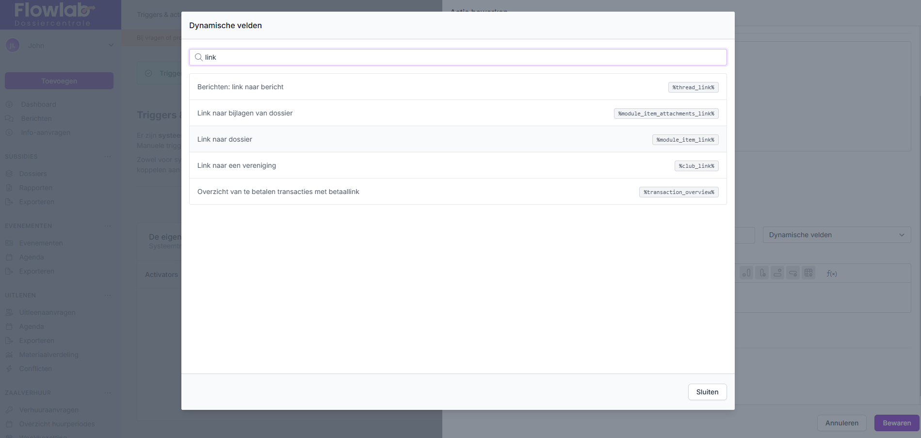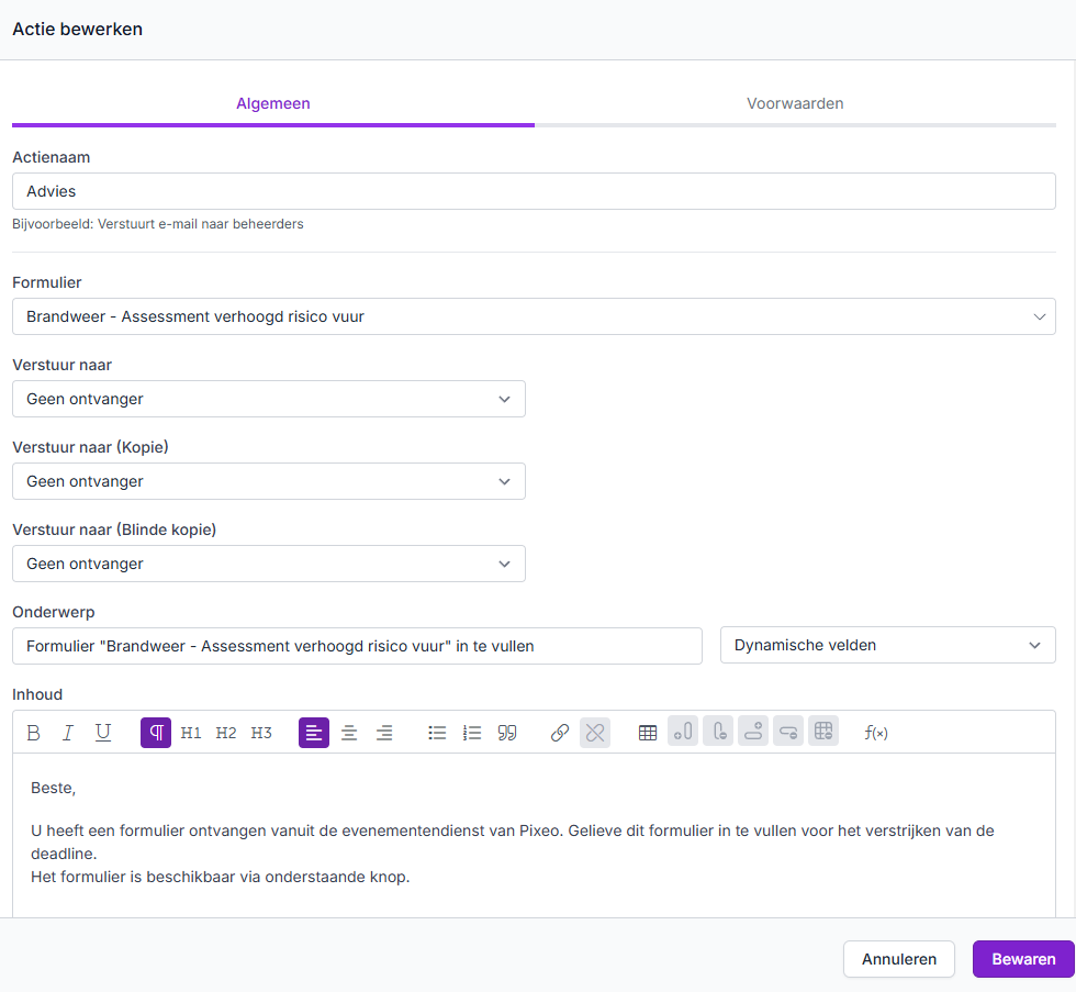 - Kies de actie die hieraan gekoppeld wordt (in de meeste gevallen een mail naar de adviesgever) en maak de actie verder op met de nodige gegevens en dynamische velden.