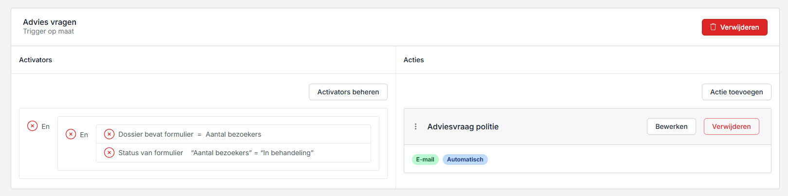 Je stelt de trigger en de actie in bij het eerste formulier, bij het formulier dat de aanvrager moet invullen.