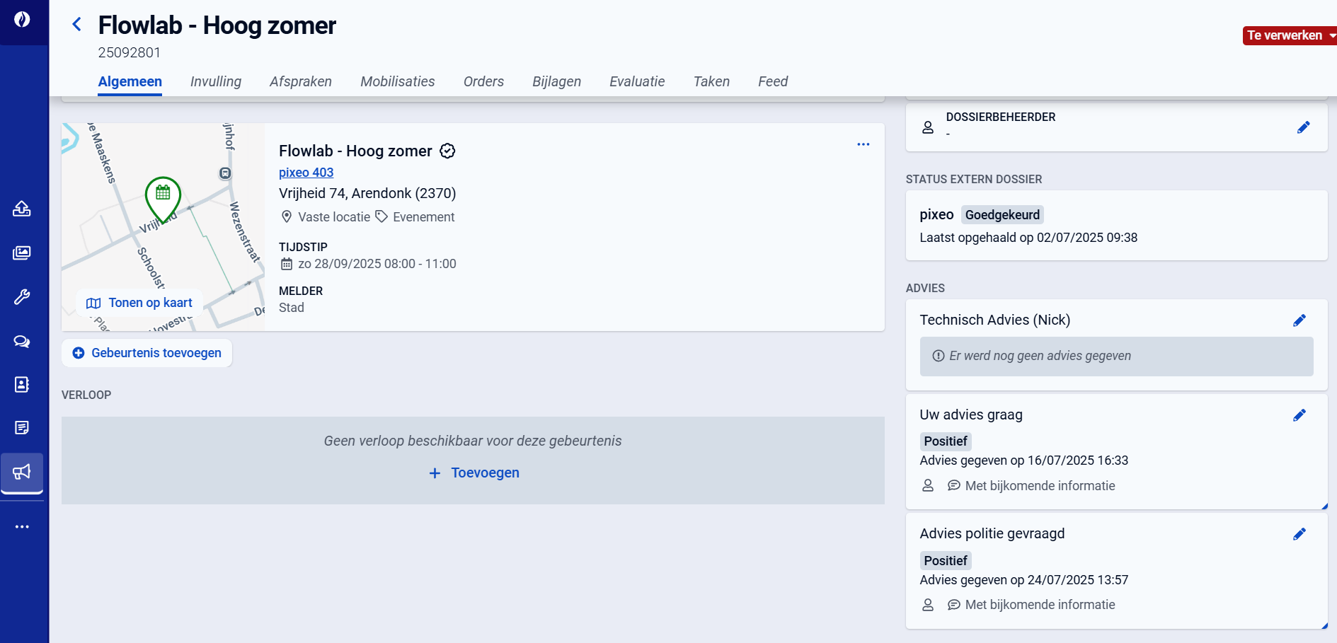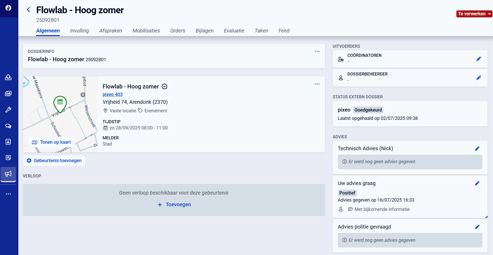 - In Flowlab komt het advies automatisch (met update om de 5 minuten) binnen in het tabblad Adviezen bij het dossier.