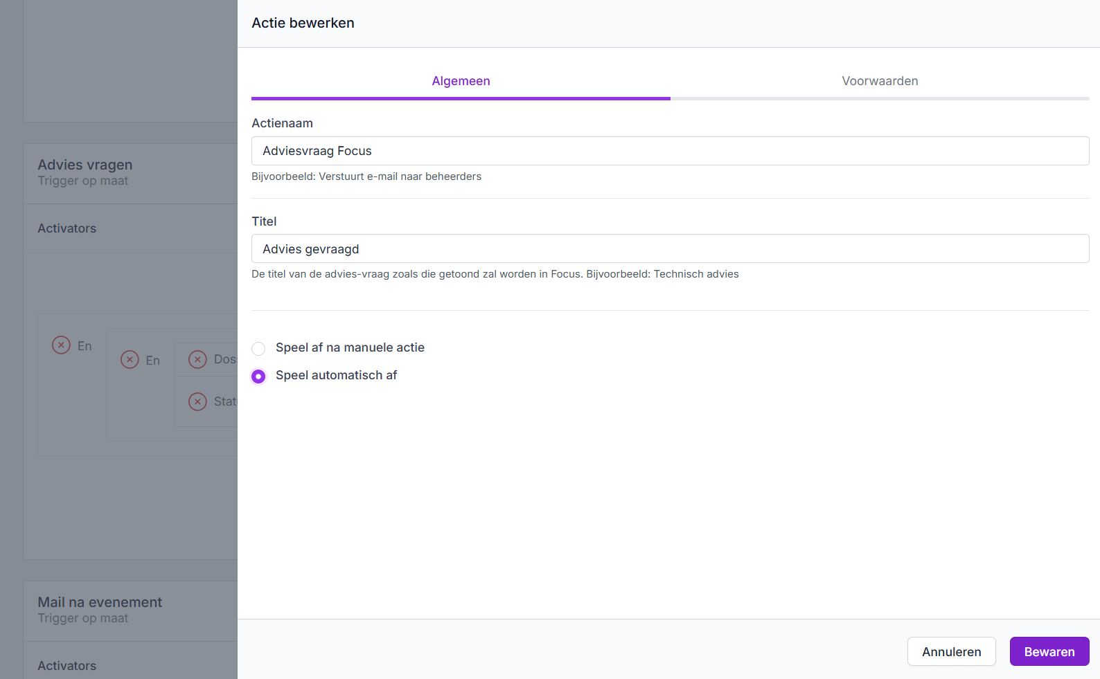 - Bepaal of de actie manueel of automatisch uitgevoerd wordt.
