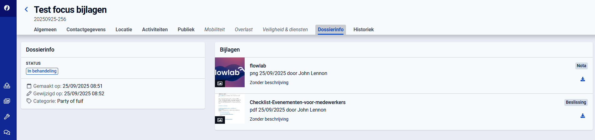 In de Focus-app vind je de bijlagen terug onder het tabje Dossierinfo, nadat je het detail van het evenement openklikt.