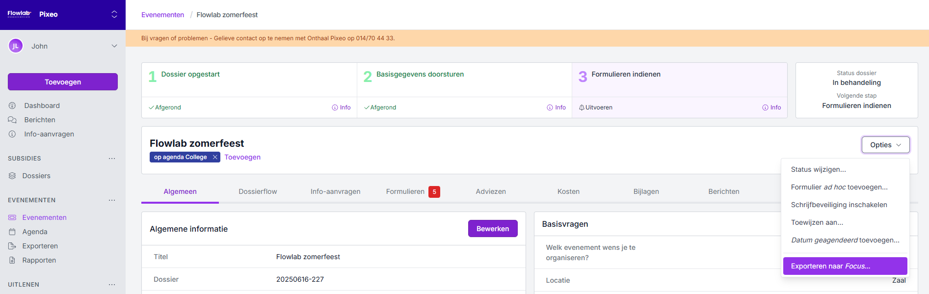 - Het dossier in Focus wordt geupdatet nadat de status in Flowlab wordt aangepast, zodat de Flowlab-status zichtbaar is in Focus.