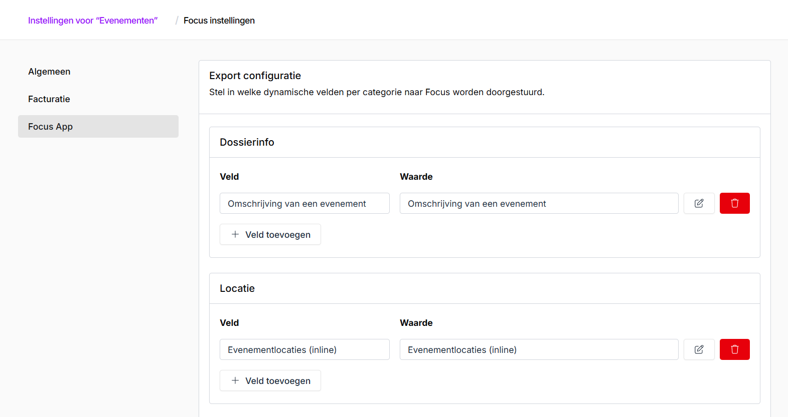 Je kan met dynamische velden volgende info extra doorsturen naar de Focus-app.