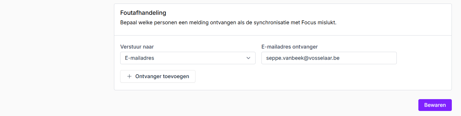 - Vul hier een mailadres in van de persoon die een melding moet ontvangen wanneer de synchronisatie met Focus niet lukt. Dit kan bijvoorbeeld wanneer een dossier in Focus reeds afgesloten werd.