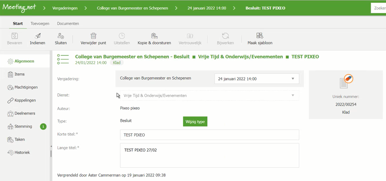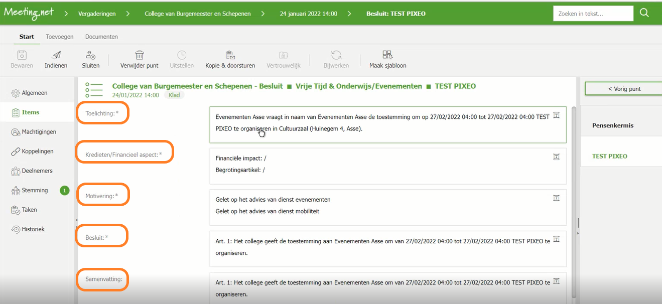 - Per punt (Besluiten Burgemeester, Gemeenteraad, of dus hier College van Burgemeester en Schepenen) kan je items toevoegen die je mee wil exporteren naar Meeting.net.