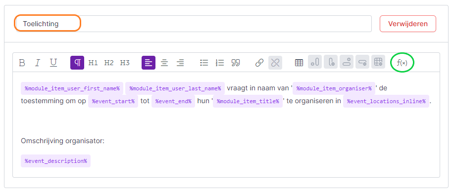 - In het tekstveld per item verwoord je de tekst zoals dit in jullie besluiten gebruikelijk is. Je kan gebruik maken van de dynamische velden om specifieke data uit het Flowlabdossier mee over te nemen. Gebruik hier geen dynamische velden die een lijst of specifieke opsomming bevatten. Deze velden zijn eerder bedoeld om een opsomming te geven in een rapport enz. Hier in de link met Meeting.net gebruik je de ‘enkelvoudige’ data: namen, start- en einddatum, titel van het dossier, etc. Tip: Voor de locatie gebruik je het dynamische veld %event_locations_inline% om het adres van de locatie mooi in de Meeting.net word file te tonen.