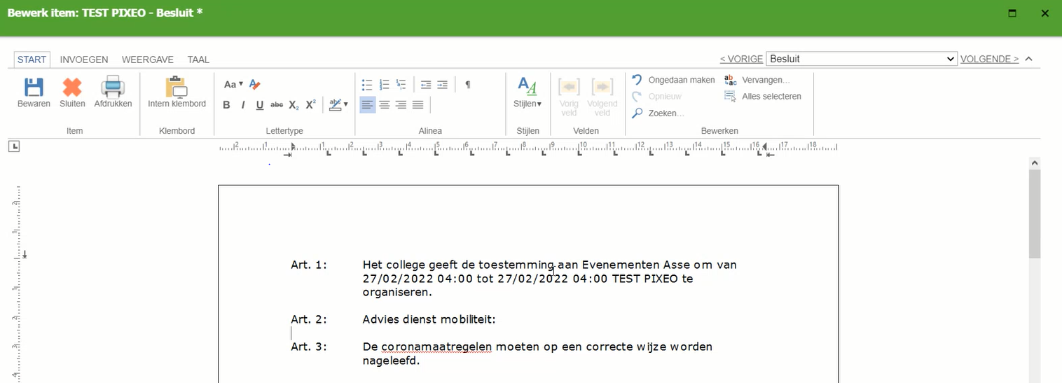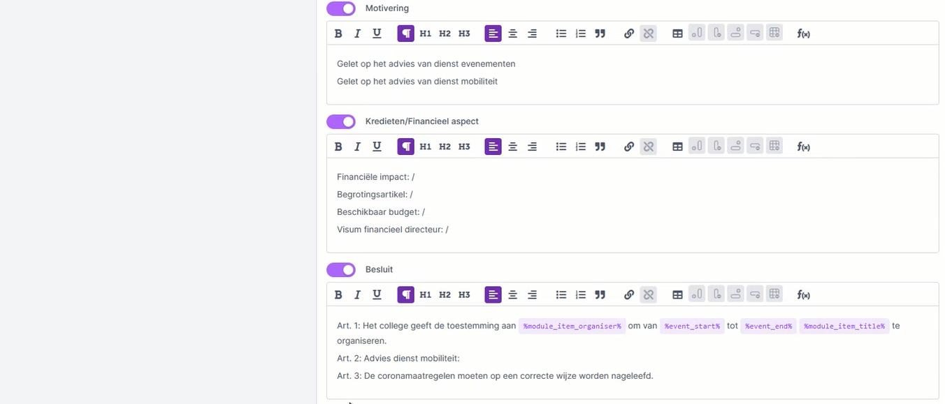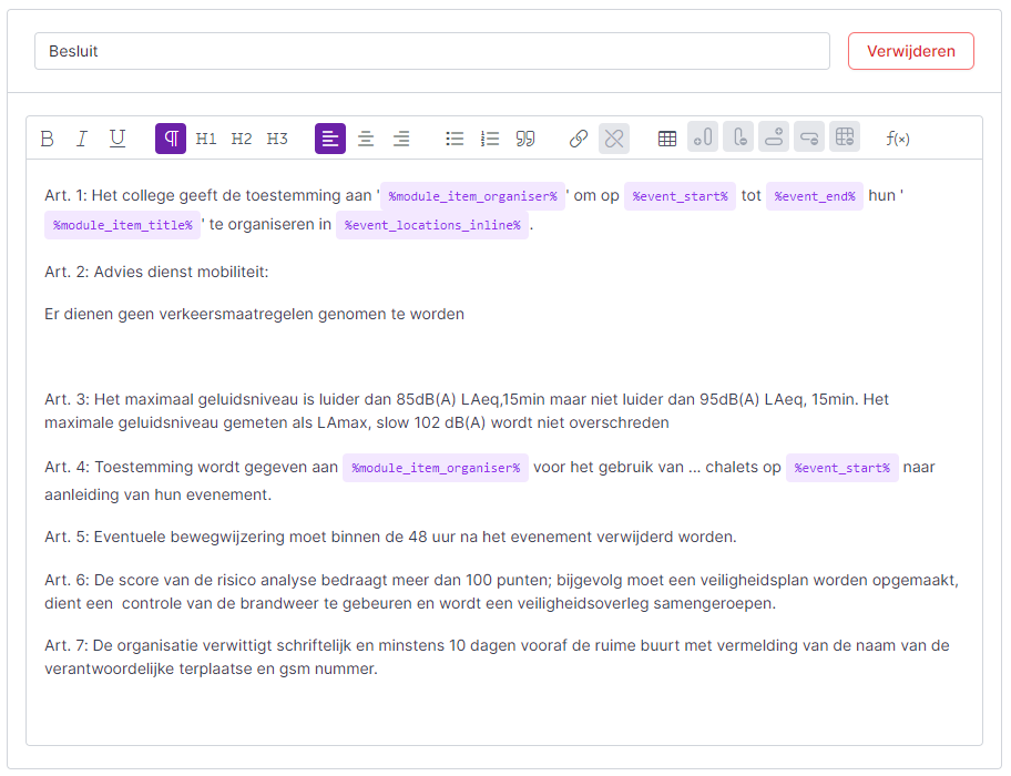 Door de integratie zorgen we er bij Flowlab voor dat de gewenste data van een specifiek evenementendossier automatisch overgenomen wordt in Meeting.net. In het voorbeeldje hierboven wil je de tekst per item in dit besluit van College van Burgemeester en Schepenen automatisch aangevuld zien met alle specifieke data uit het geëxporteerde Flowlab dossier. Op die manier moeten er nadien misschien nog een paar bijzonderheden aangevuld worden in dit besluit maar hoeft er niks meer overgetypt te worden.